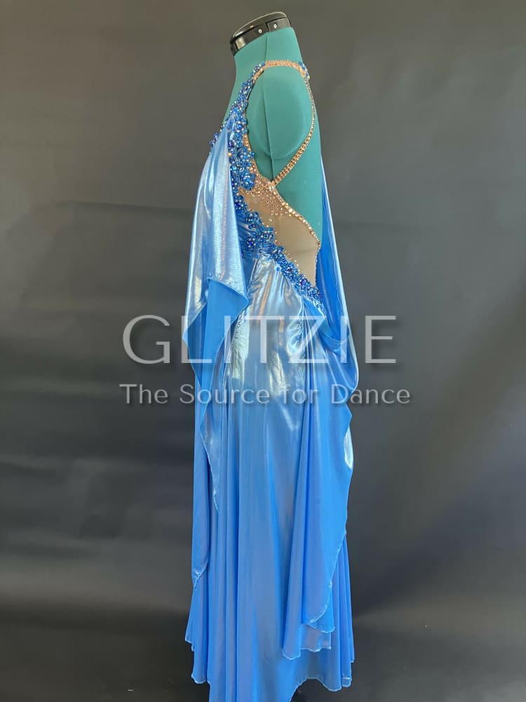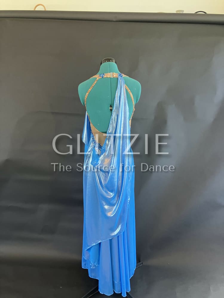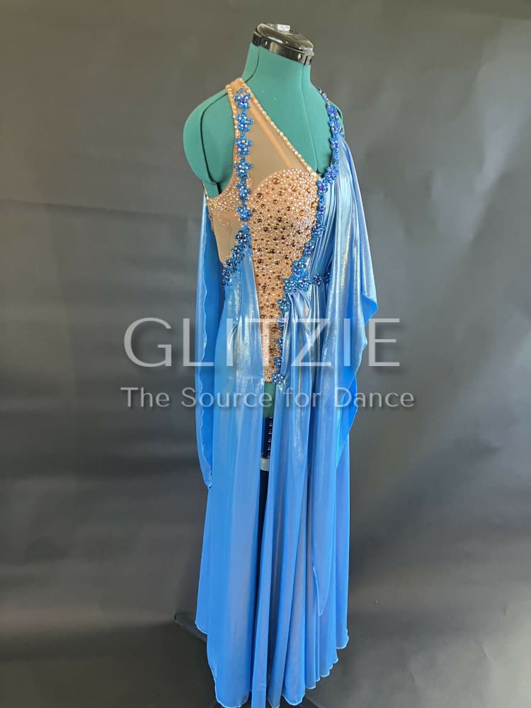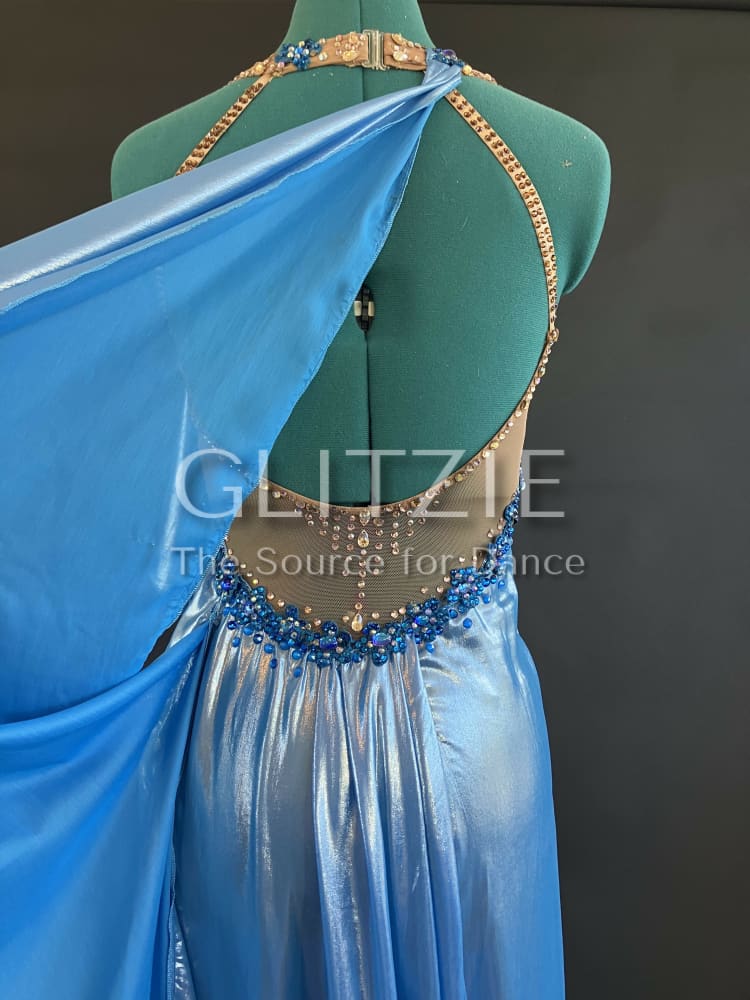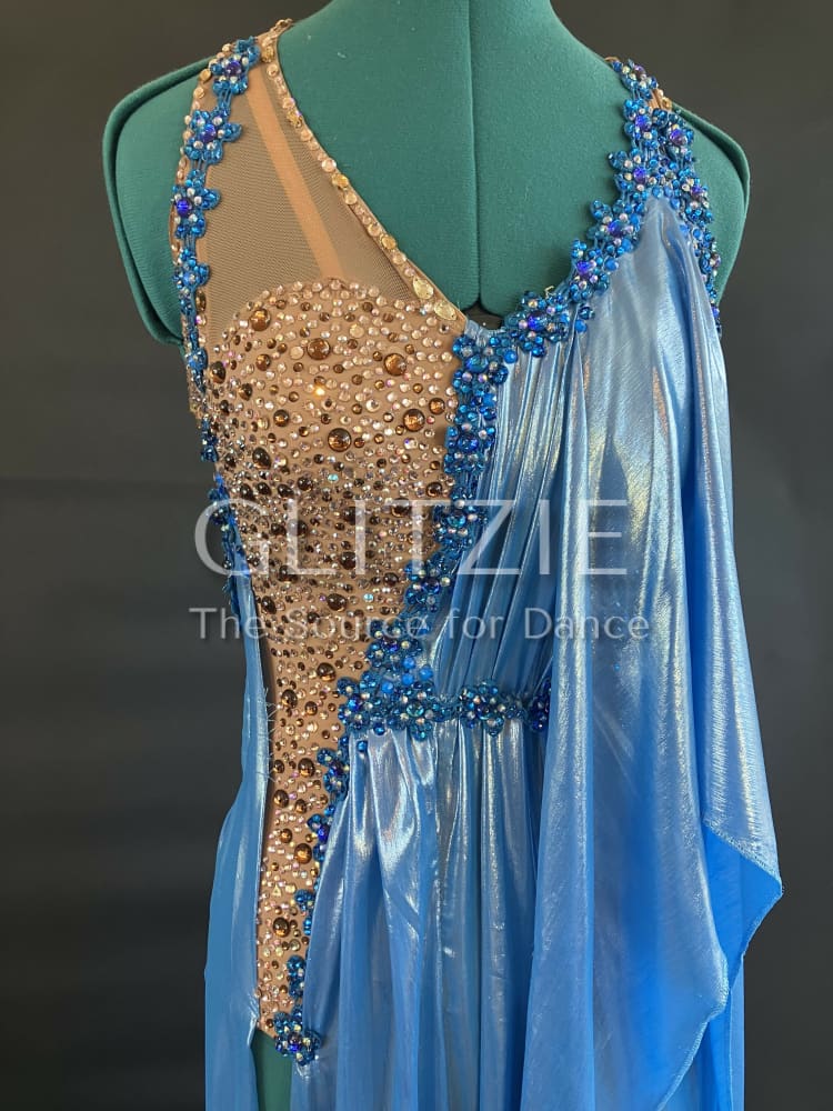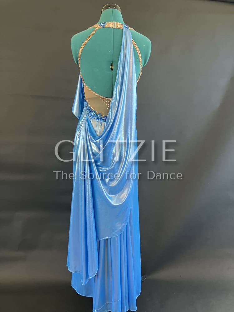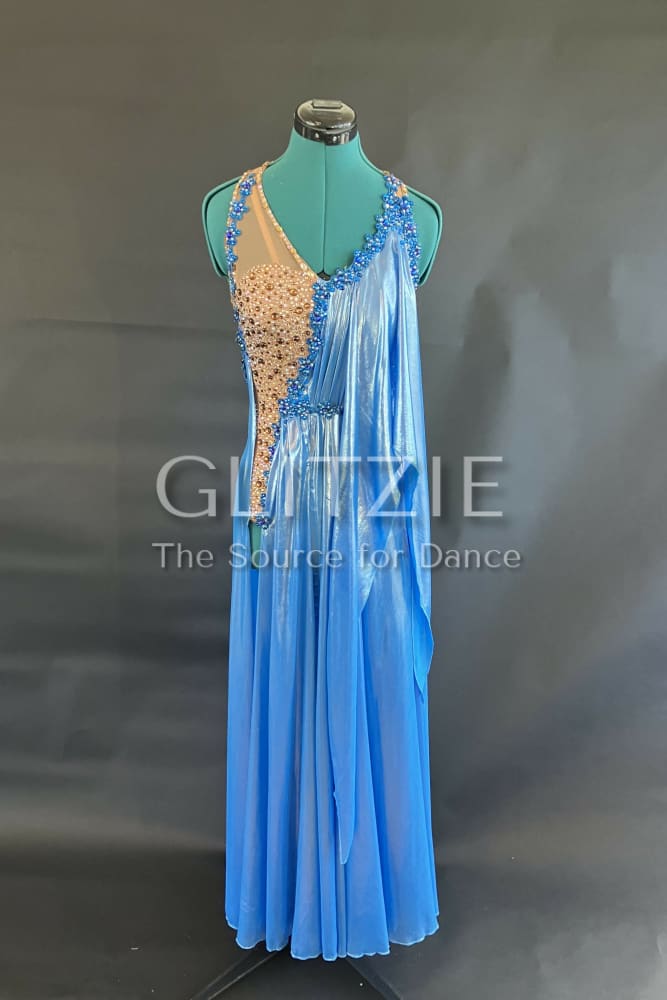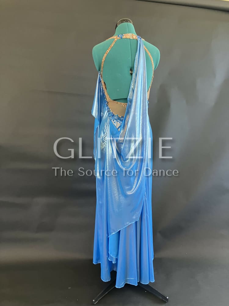 Sponsor American Smooth gown. This beautifully draped dress had a custom nude body suit with stoning, and incredibly light metallic blue stretch chiffon fabric. Stones are predominately Presciosa with Swarovski carbochons and stoned lace. Built in cups size c. Dress is size small but very stretchy. Bust 32-37, waist 24-29, hip 32-39. Height shoulder to hem 53, for a dancer under 5’ 7”.