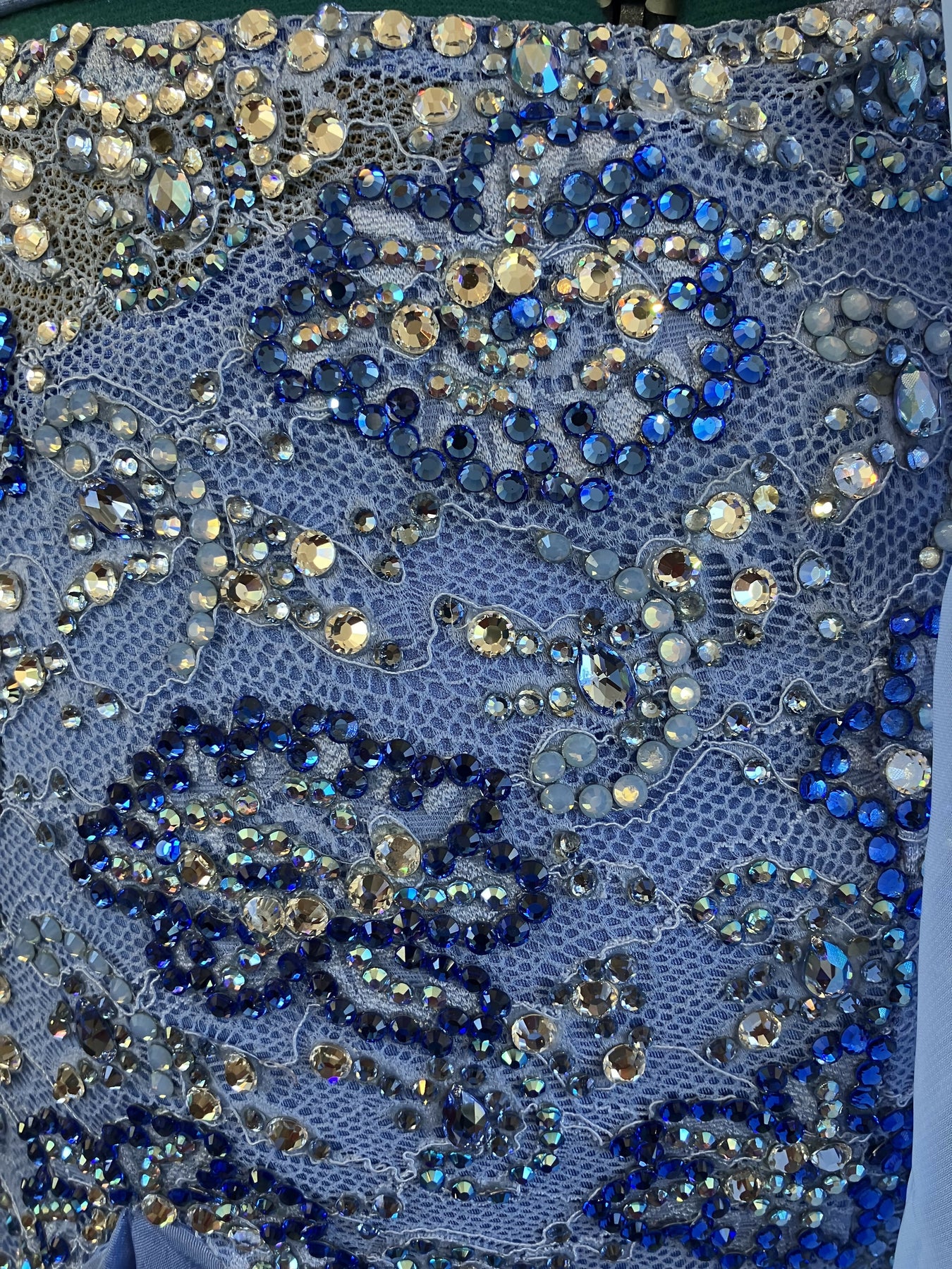 Sponsor dress made entirely with fabrics by Chrisanne Clover in Bluebell. Stones are Swarovski with a few Presciosa. This dress really shines on the floor with layers of luxury satin chiffon and over 6800 crystals! Bodice is made of mesh overlaid in lace. Built in bodysuit and bra cup c. Size small. (2-6 US).