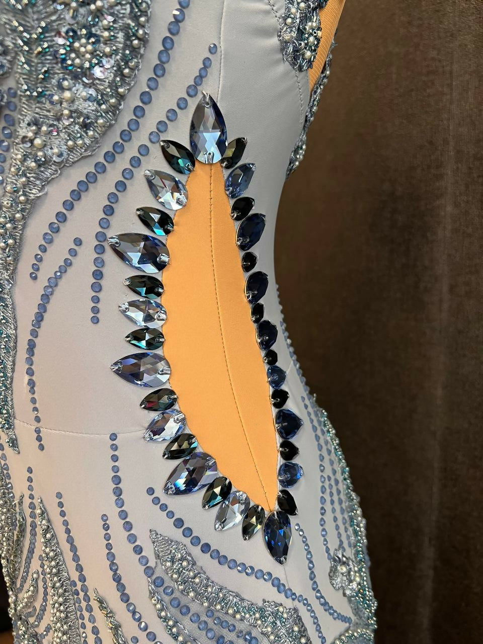 Accessories included: earrings with sewn rhinestones, elastic biceps bracelets, elastic biceps bracelets with chiffon floats and scarf.