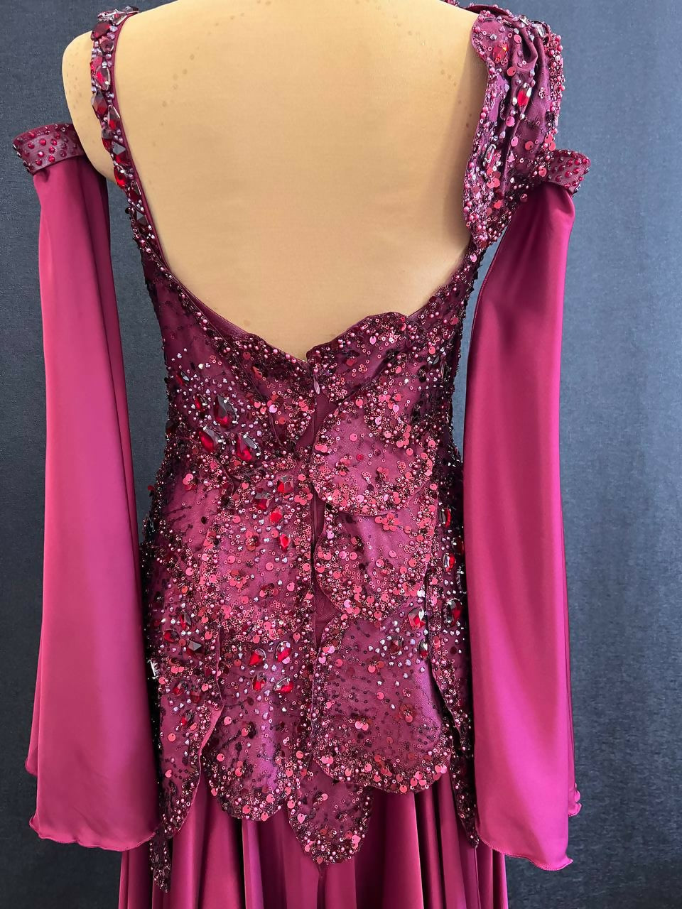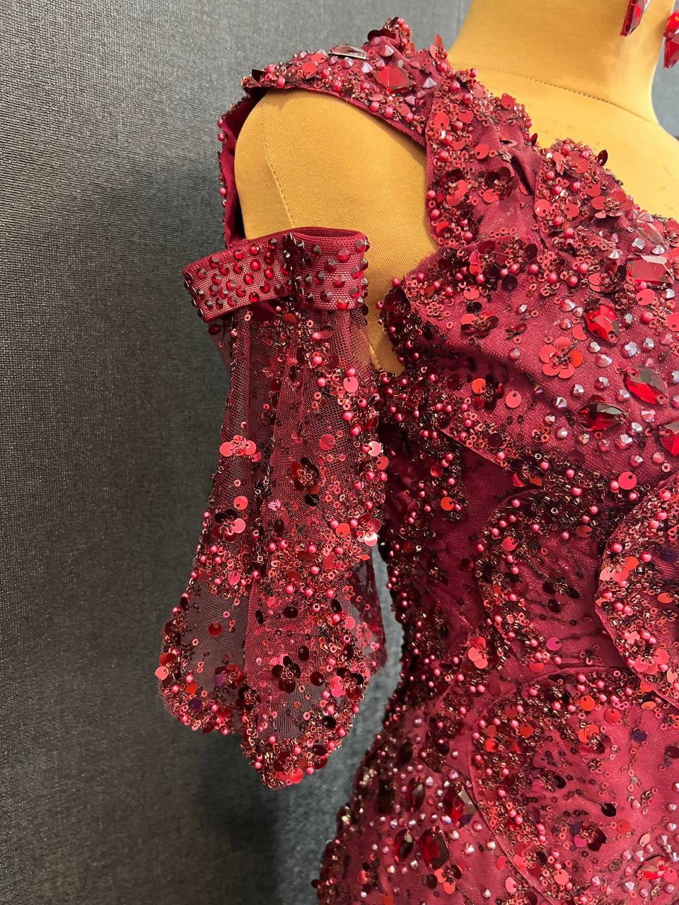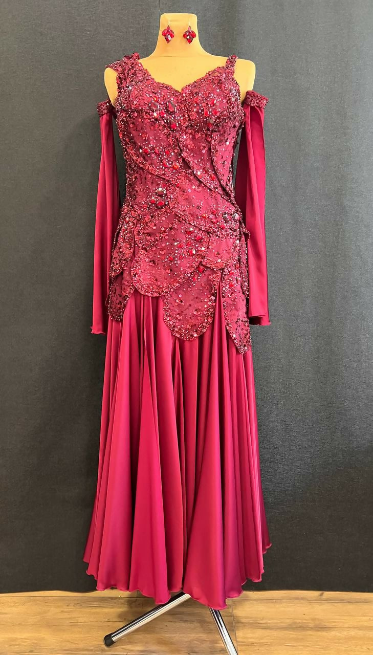 The dress is embellished with sewn rhinestones different shapes and sizes colors Dark Siam and Burgundy, a lot of glued rhinestones Dark Siam Mocha SS20, SS30.
