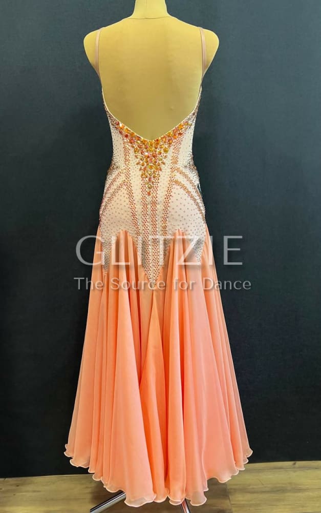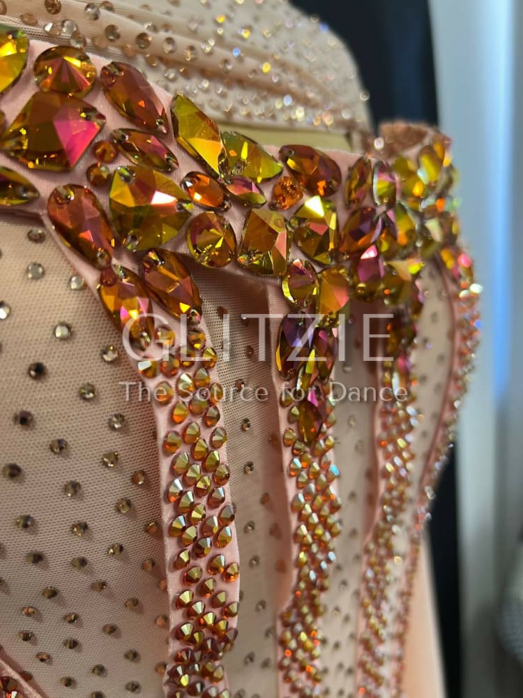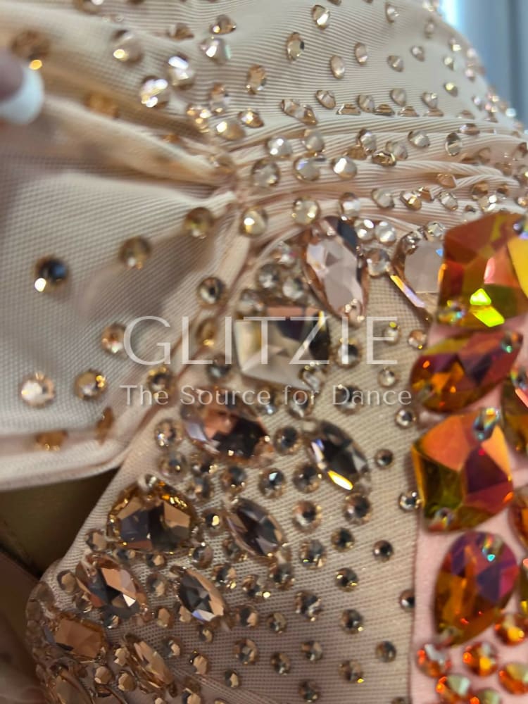 The dress is embellished with rhinestones (similar to Swarovski), sewn rhinestones different shapes and sizes colors Lux Light Peach and Lux Astral Pink, a lot of glued rhinestones Lux Mist Pink Peach SS20,  Lux Light Peach SS16, SS20 and Lux Astral Pink SS16, SS20.