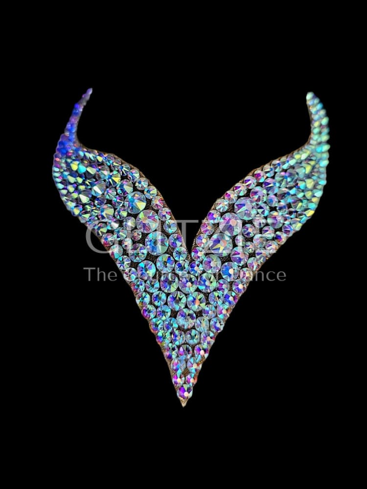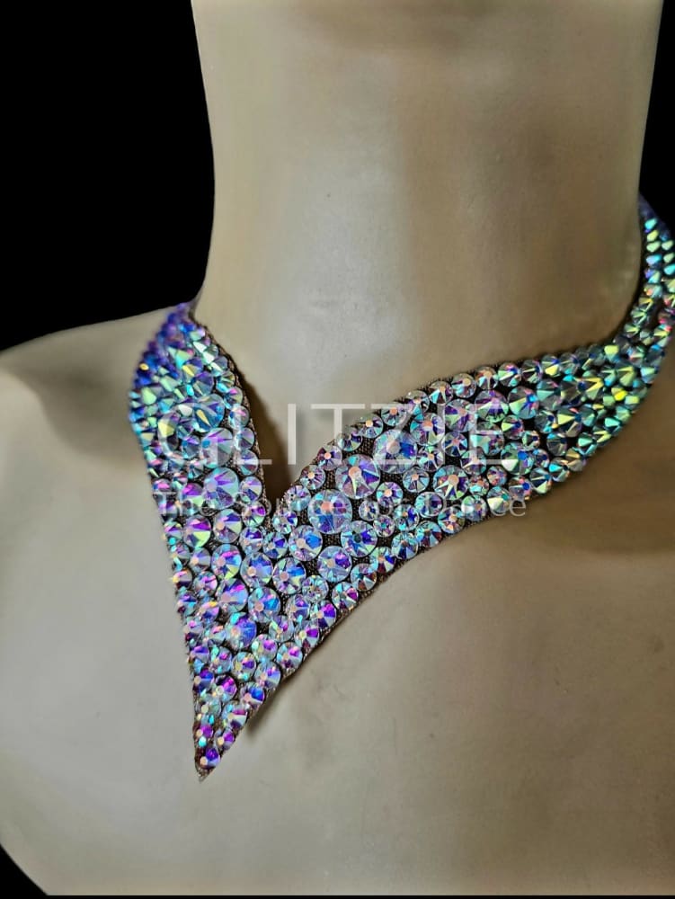 Ballroom Dance Competition Necklace with rhinestones for any occasion – bright, shiny, and beautiful! Necklace made with “Luxe” AB elements and has very comfortable skin-safe silicone backing. This maintains its position on the skin with sudden movements and turns. The back closes with a hook closure. It can be worn at a performance, party, wedding, or any other event. Iridescent stones will definitely attract attention to you.