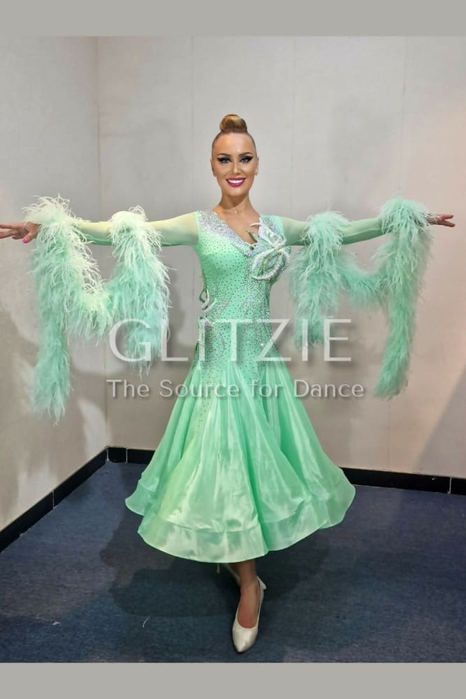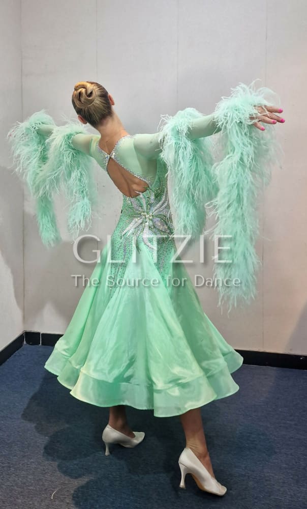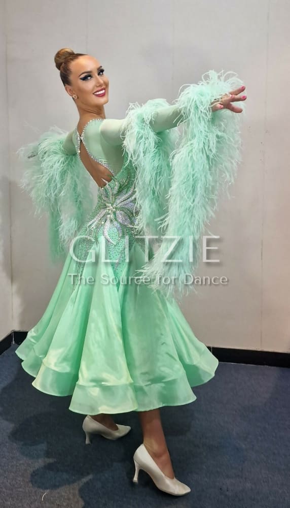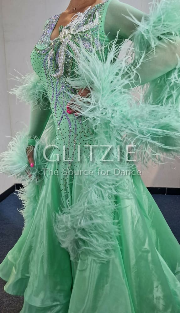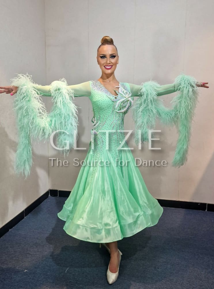 This dress you see now is truly magical!💚 Able to enchant with its ideality shining mint green color, it is like an easy dream… Spotting a lady wearing this dress on the dance floor can make you feel like you've stepped into a magical realm🥰. Lightly falling feathers, summer freshness color and harmonious pleats - complete harmony between love and dance. Every talented dancer can blossom like a magical rose when she wears a highly visible dress.❤️ Sometimes the greatest power lies in the dress itself...