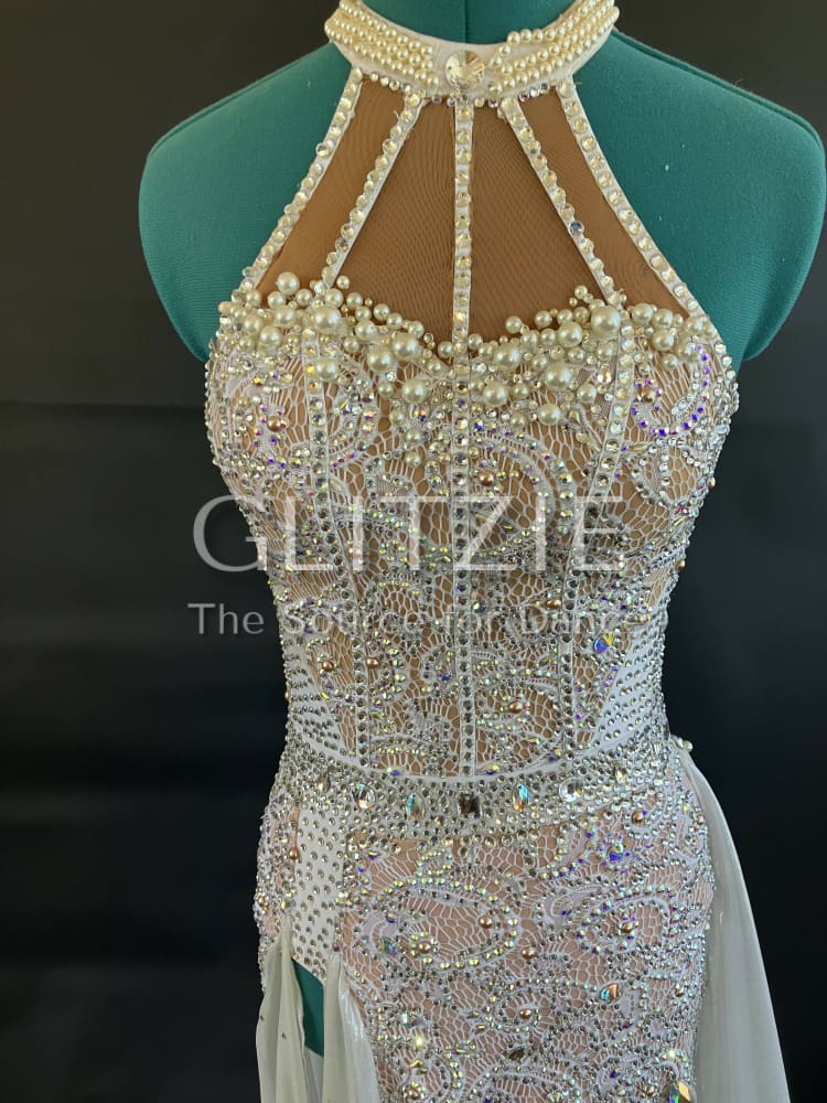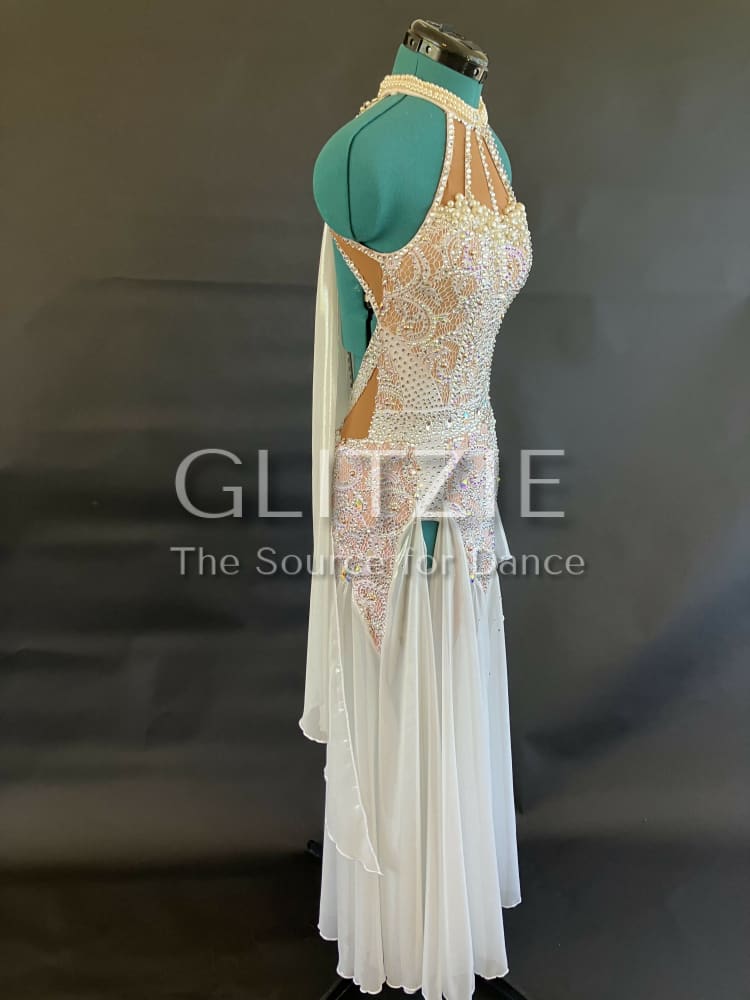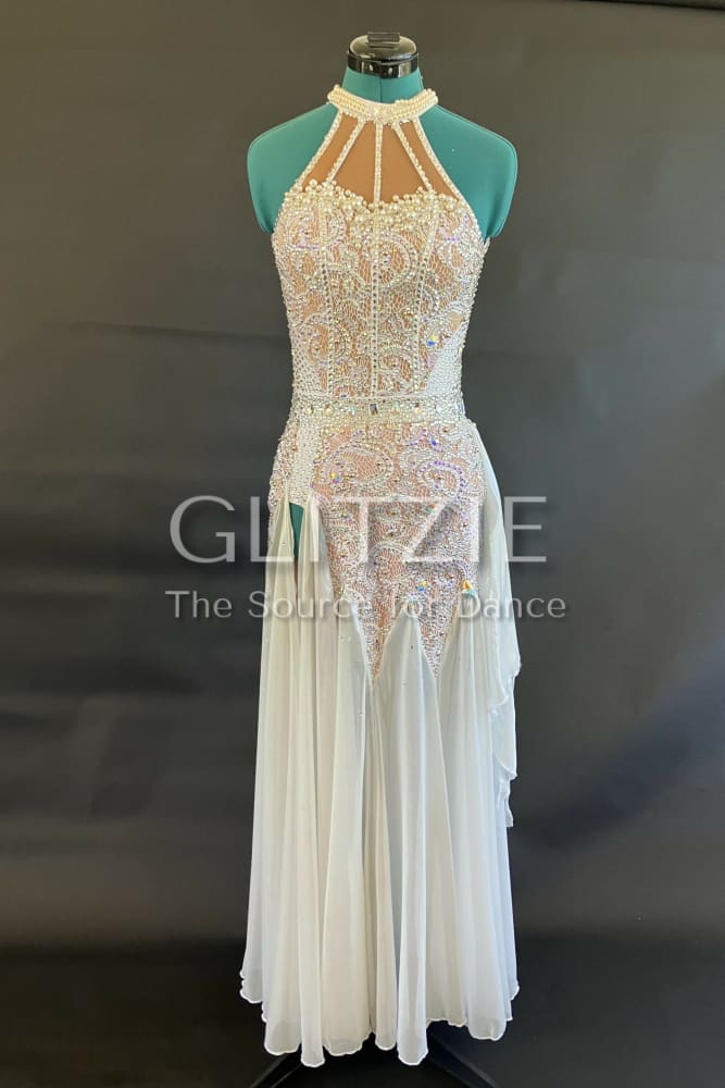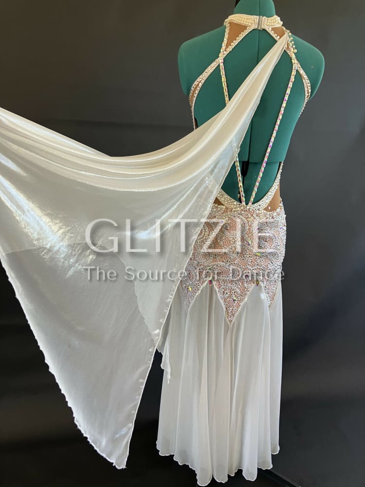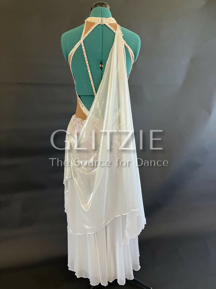 Incredible dress loaded with Swarovski pearls and some large vintage pearl beads, and over 6000 Presciosa and Swarovski crystals. Corset style fitted bodice with C cups. Size small, the skirt and draped fabric is an incredibly light and floating white metallic chiffon. This is a finals dress for a queen! Height shoulder to hem 53, bust 32-38, waist 24-29, hips 32-38. Idea for a dancer under 5’7”. Size small.