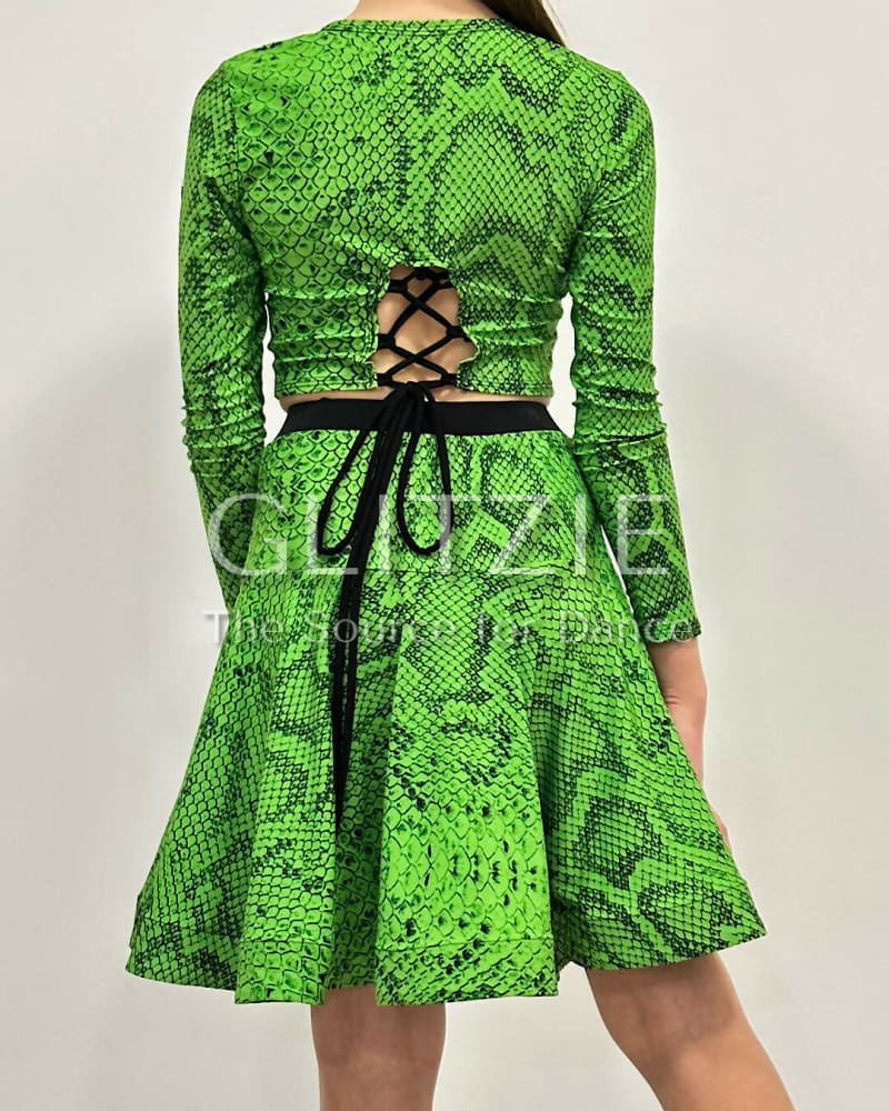Snake-print dance set featuring a stylish top and skirt. The fitted top offers comfort and freedom of movement, while the dynamic skirt with slits enhances performance flair. Made from stretchy, lightweight fabric, perfect for practice or performances. Bold and elegant for a confident look on the dance floor.
