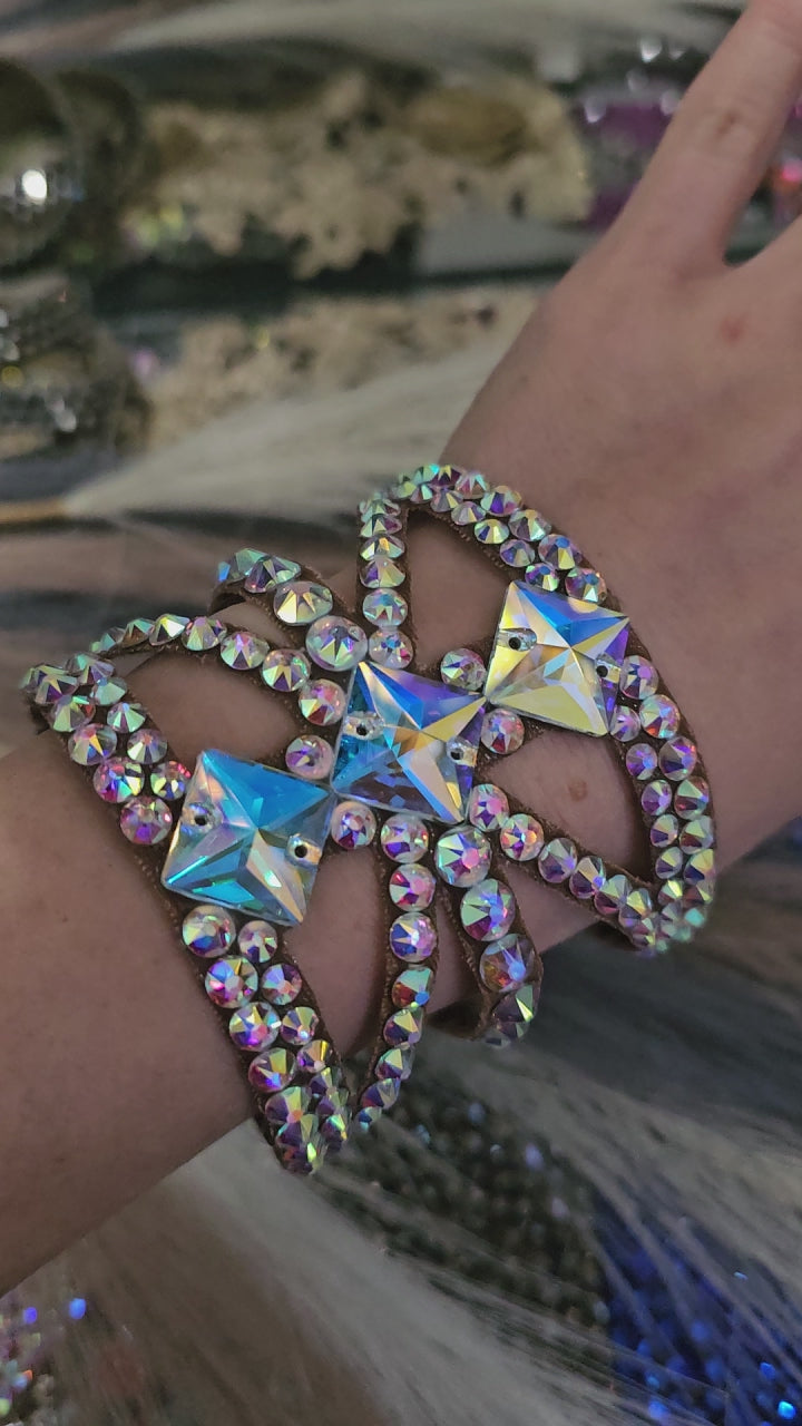 This bracelet Crafted from lightweight materials and premium glass crystals. The back is lined with hypoallergenic selecon, ensuring a secure fit during movement and turns, while remaining gentle on the skin. Crystals AB (luxe)