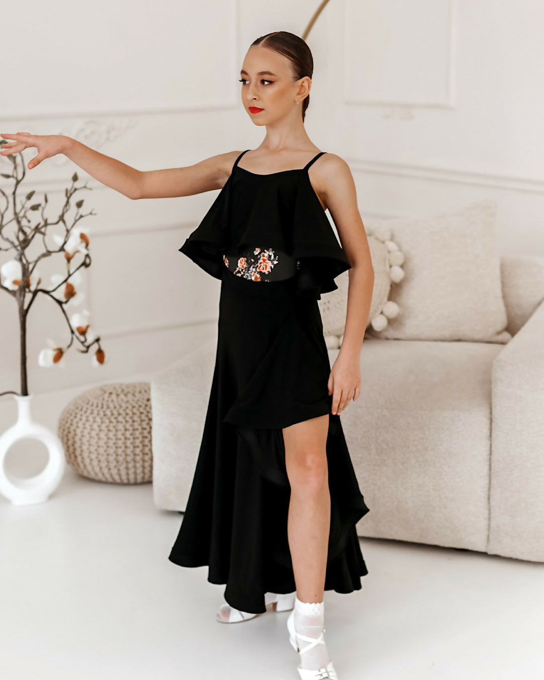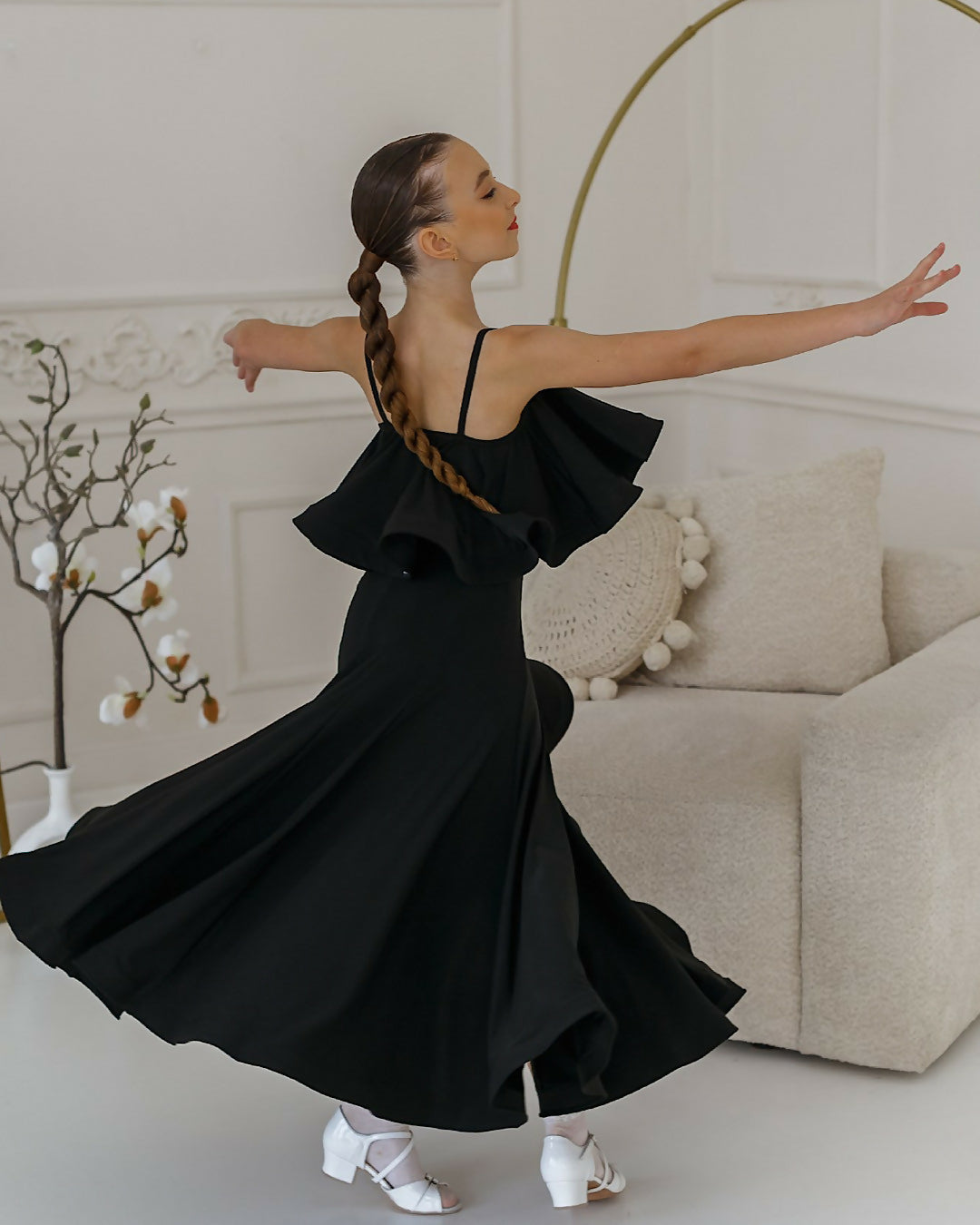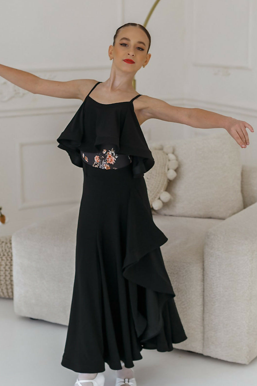 Elegant and flowy skirt designed for ballroom dance. Features a soft waistband and a wide flounce that enhances movement and adds dynamic flair. Perfect for practice or performance.