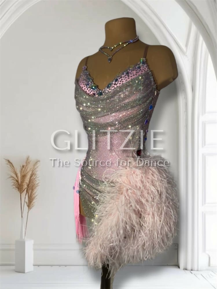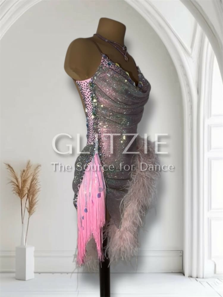 Delicately draped with a feather boa trim, this dress adds drama, elegance, and fluidity to every motion, making it perfect for expressive Latin performances. Whether you’re on the competition floor or lighting up a showcase, this dress promises unforgettable impact, grace, and fierce femininity.
