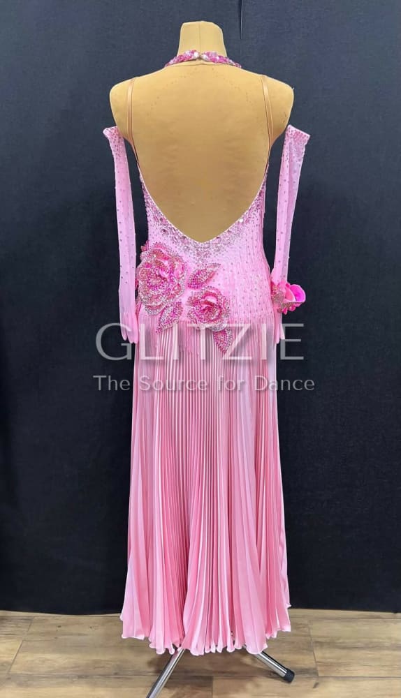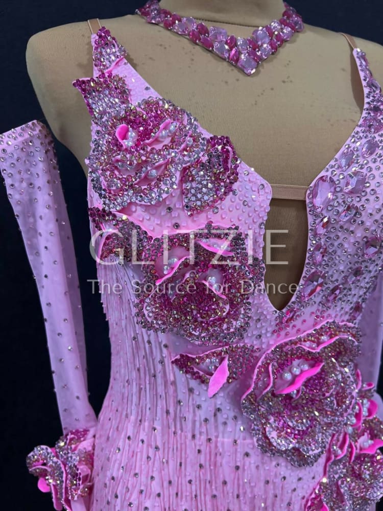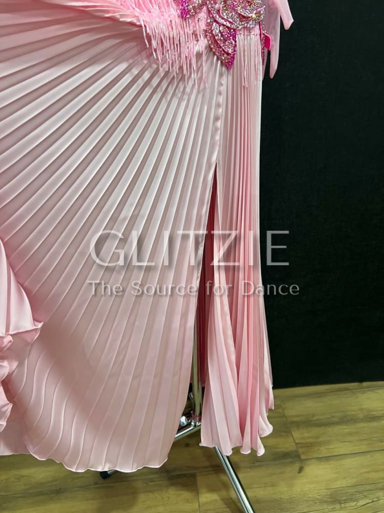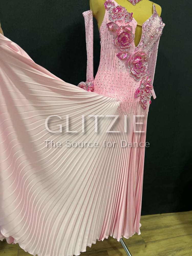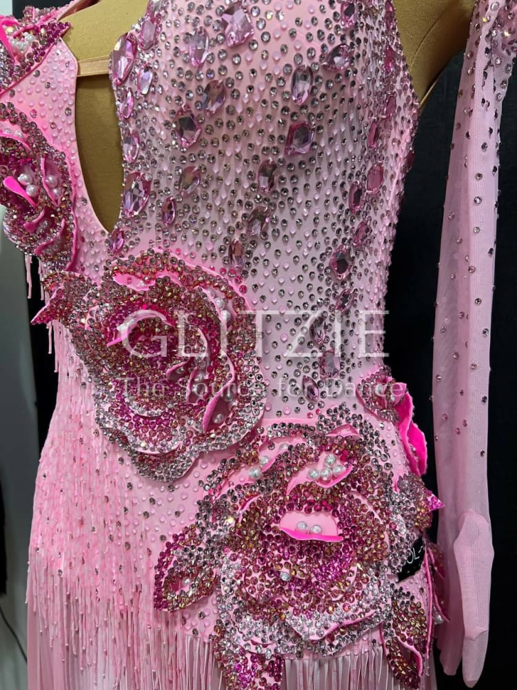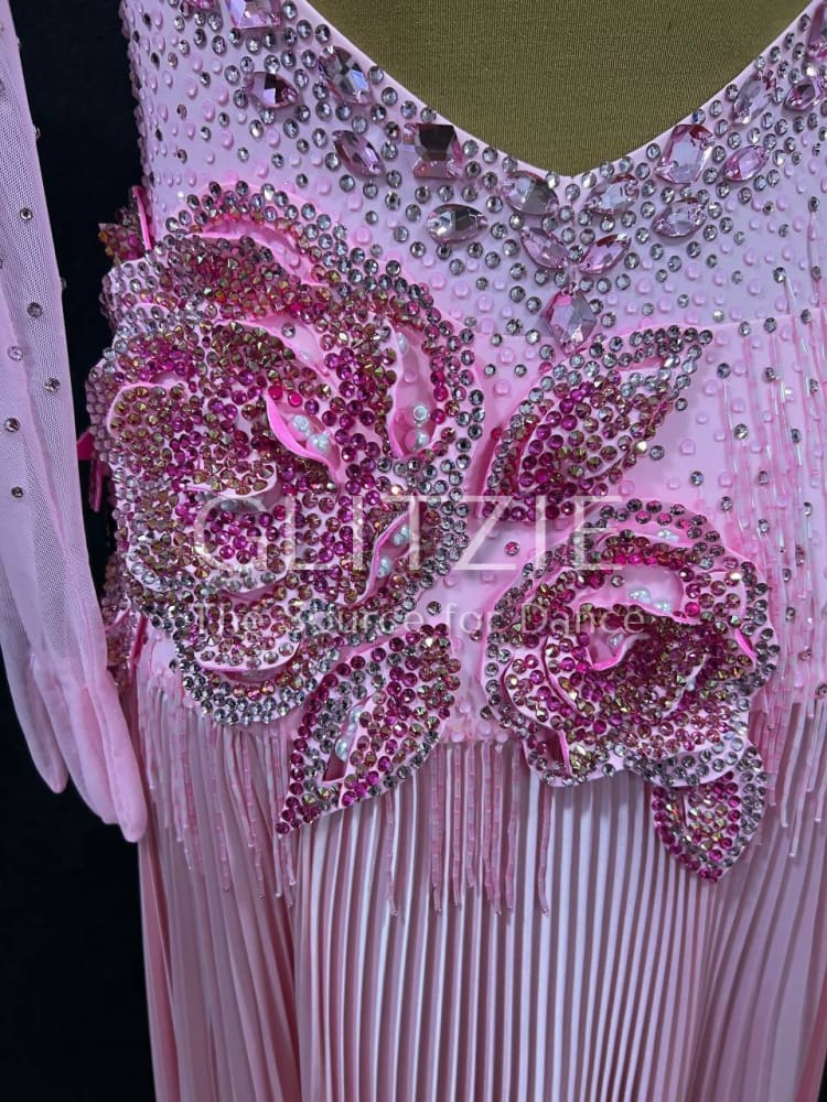The dress is embellished with sewn rhinestones different shapes and sizes colors Light Rose, a lot of glued rhinestones Light Rose SS16, SS20, Rose SS16, SS20, Rose ab SS20 and Mocha Rose SS16, SS20 and sewn pearl beads color White.