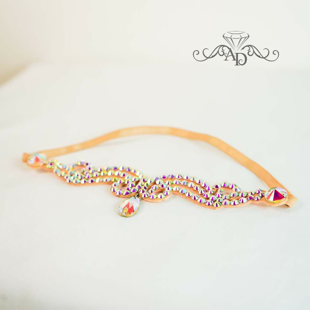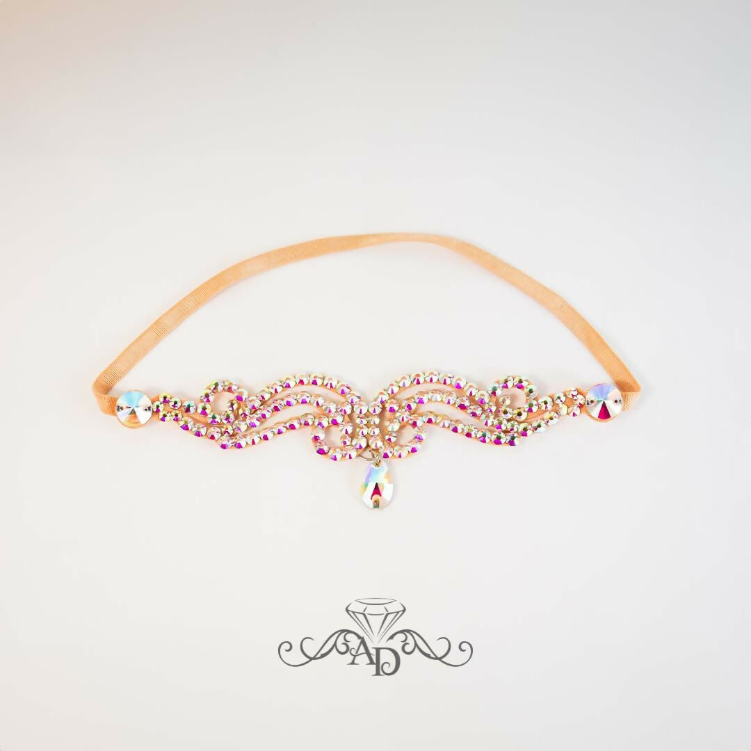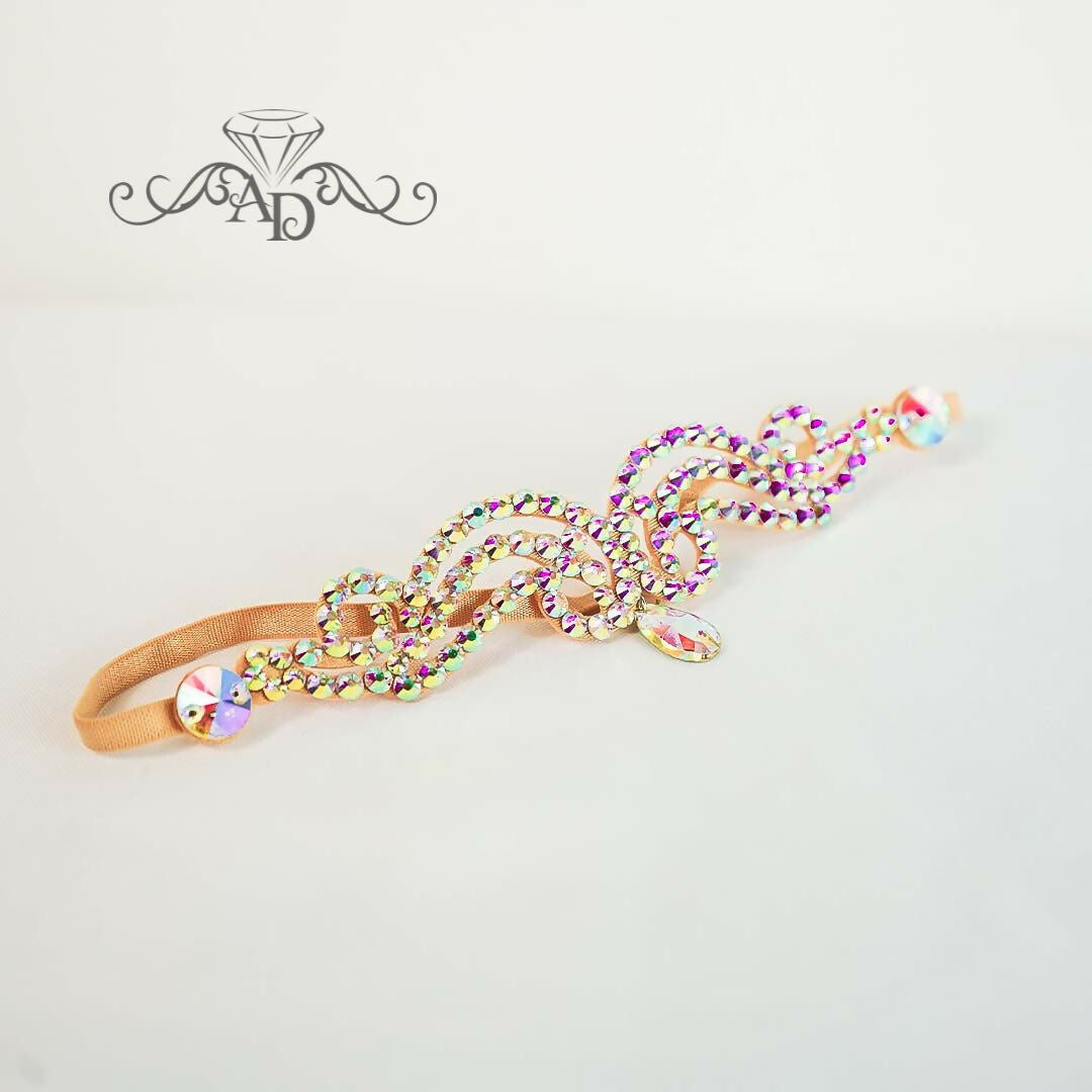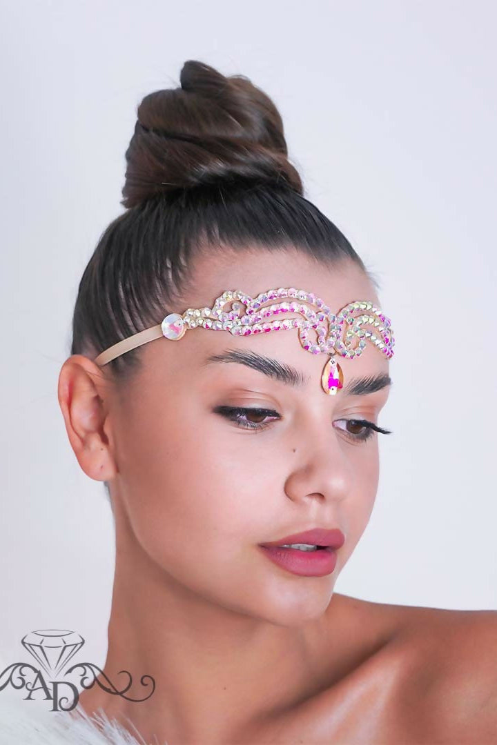 This high-quality dancer jeweled headband is attached around the head with elastic band and has snap closure.