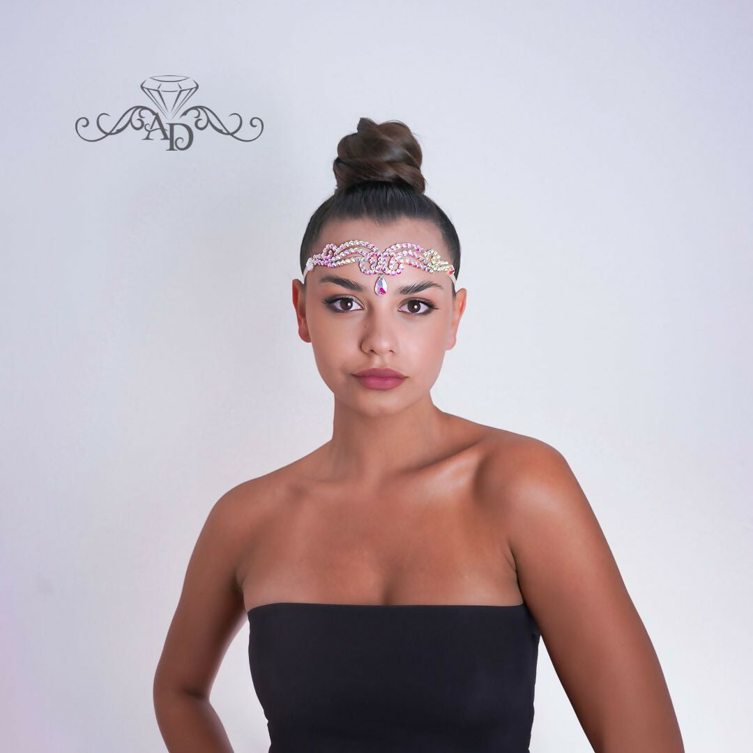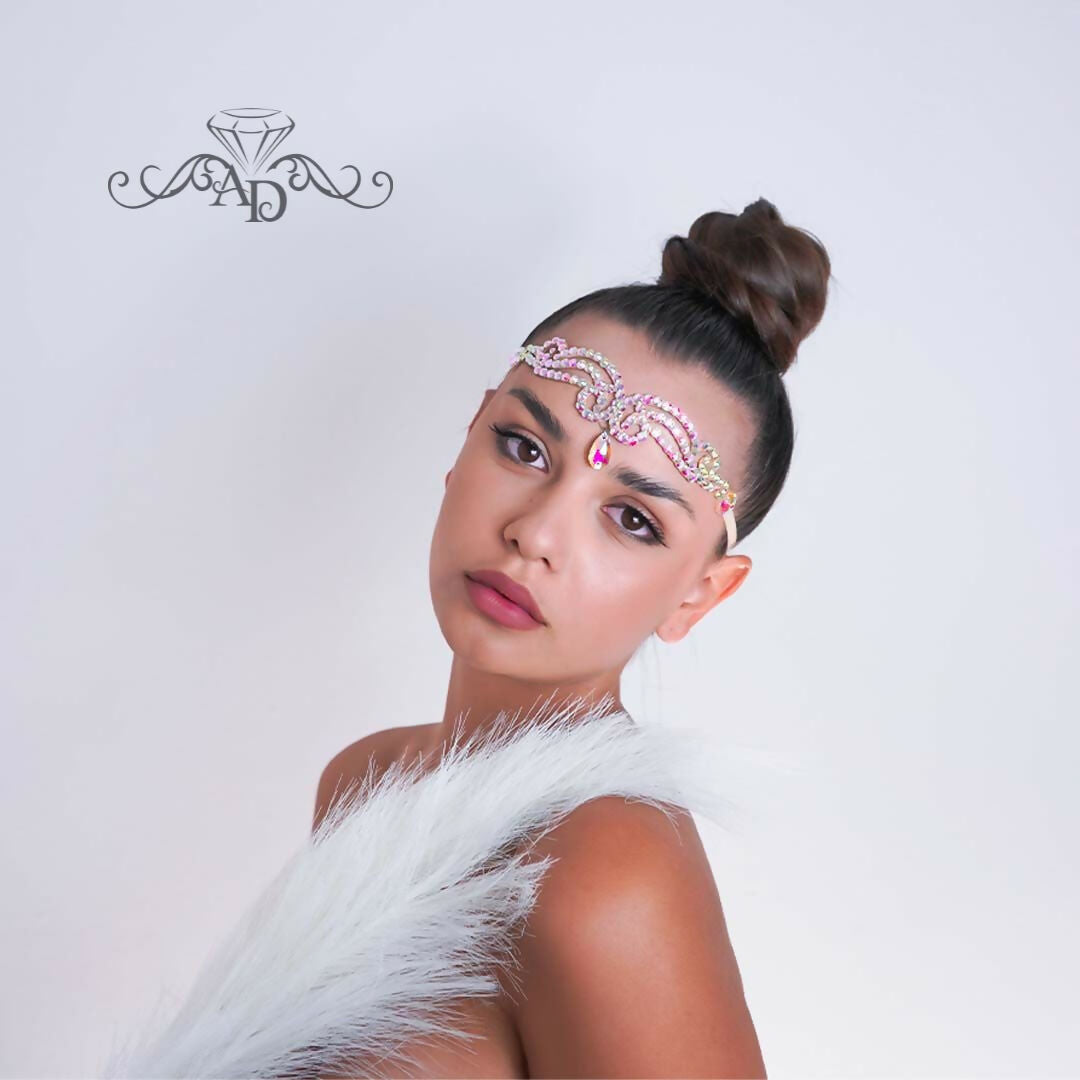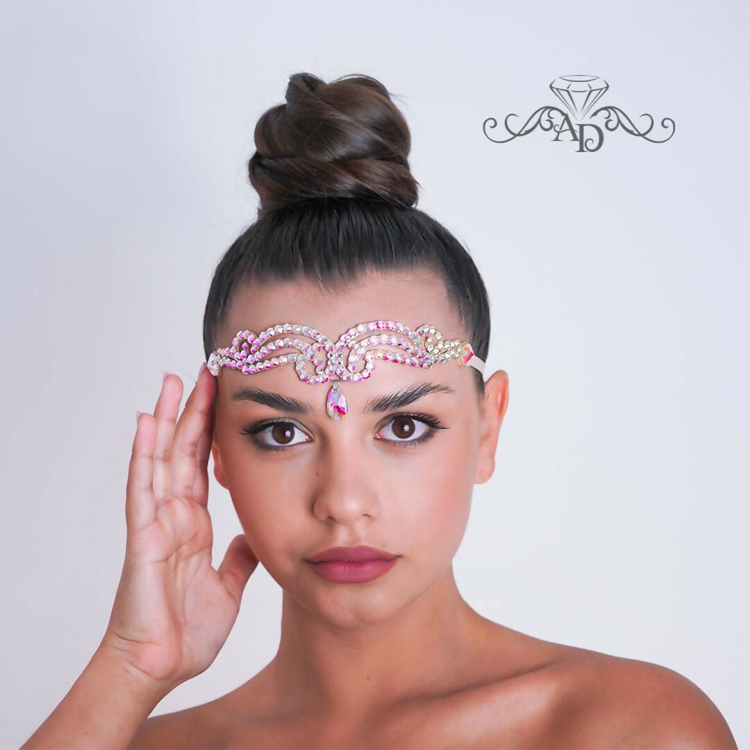 This high-quality dancer jeweled headband is attached around the head with elastic band and has snap closure.