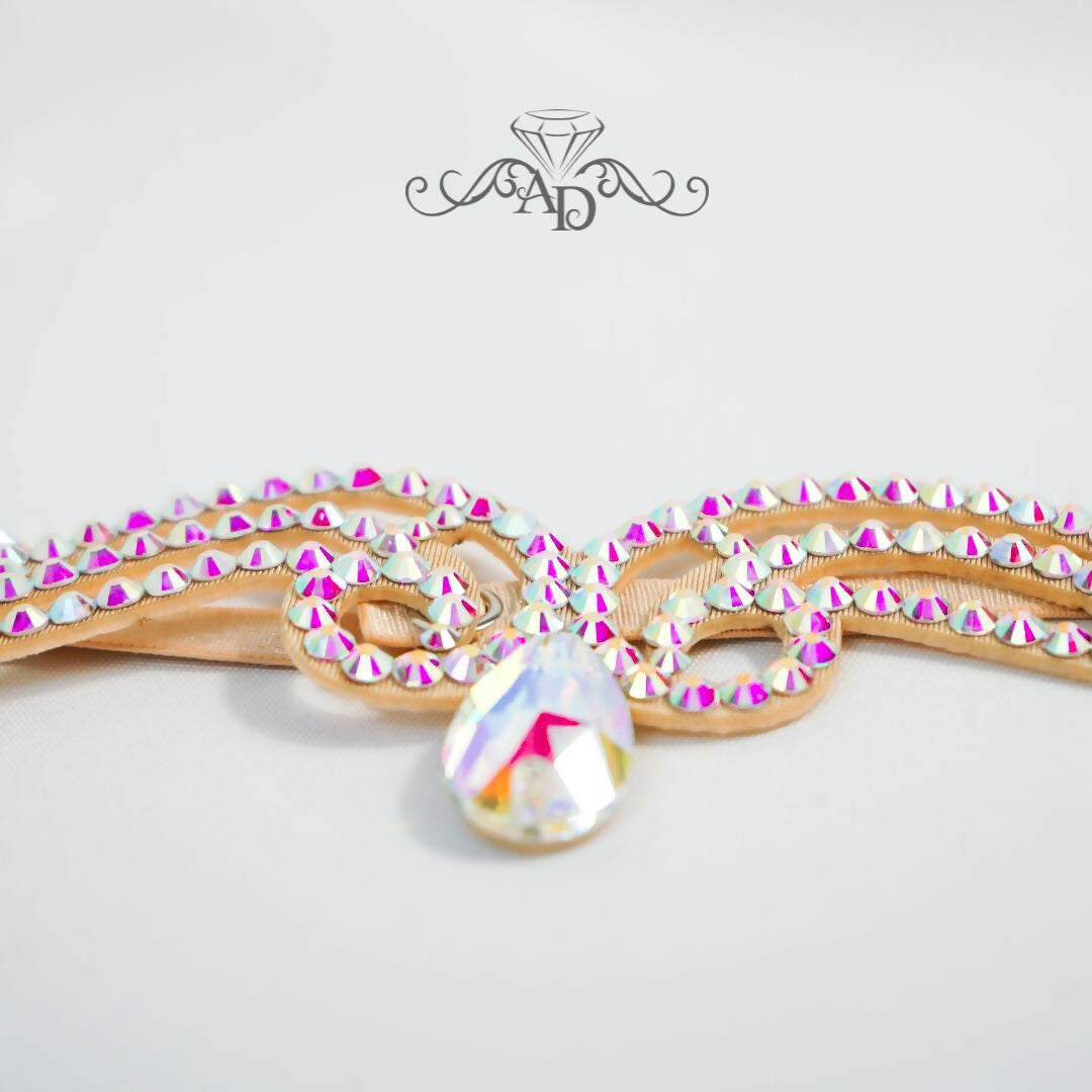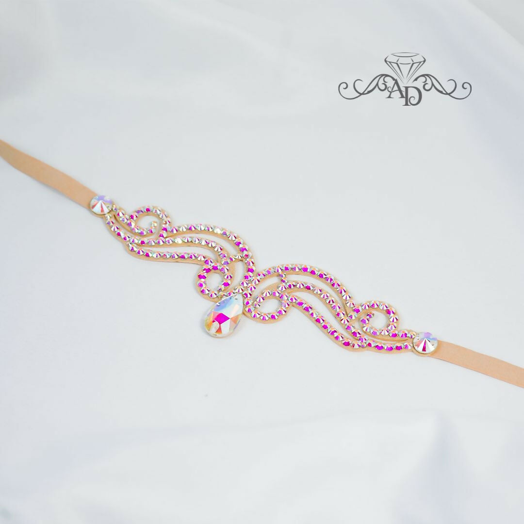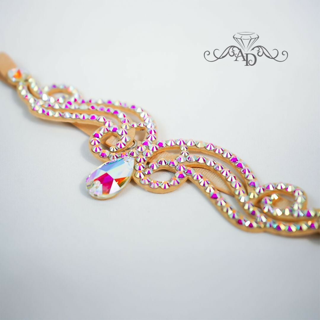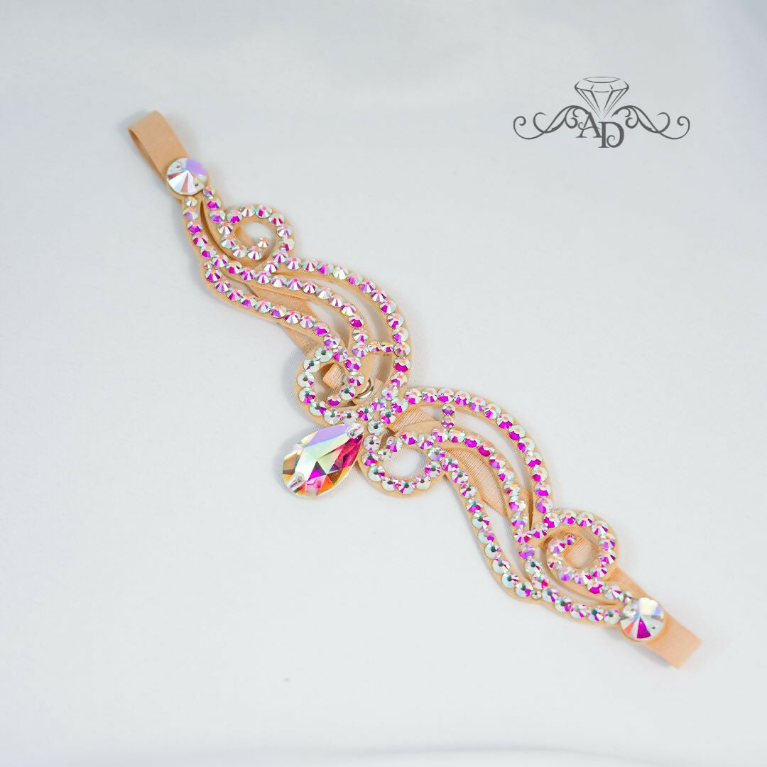 This high-quality jeweled headband is attached around the head with elastic band and has snap closure.