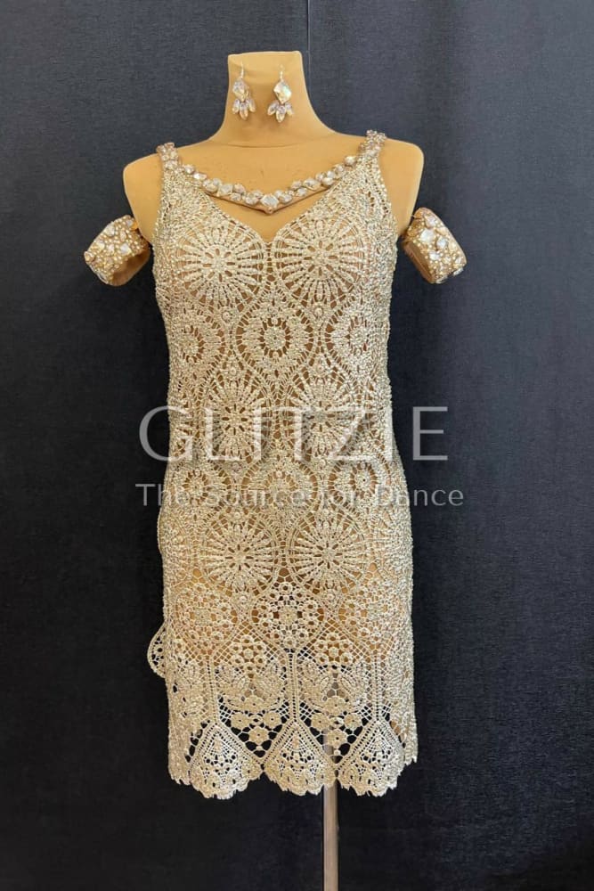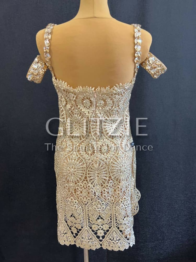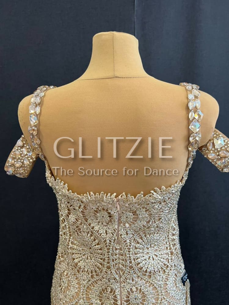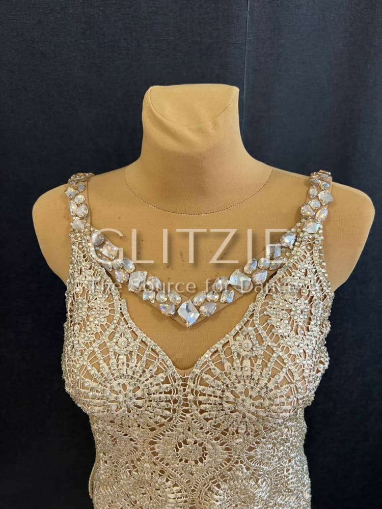 The dress is decorated with sewn rhinestones different shapes and sizes color Golden Shadow, a mass of glued rhinestones Golden Shadow SS20.