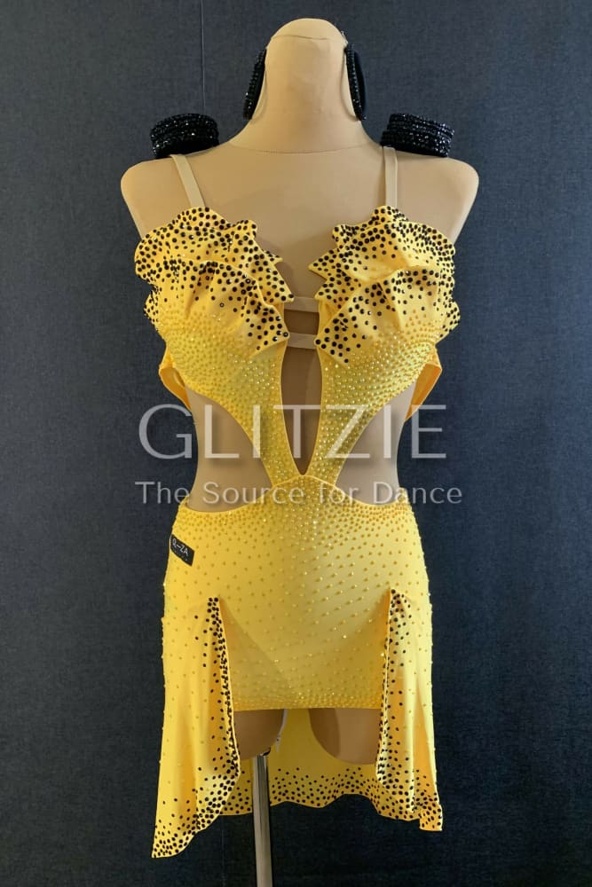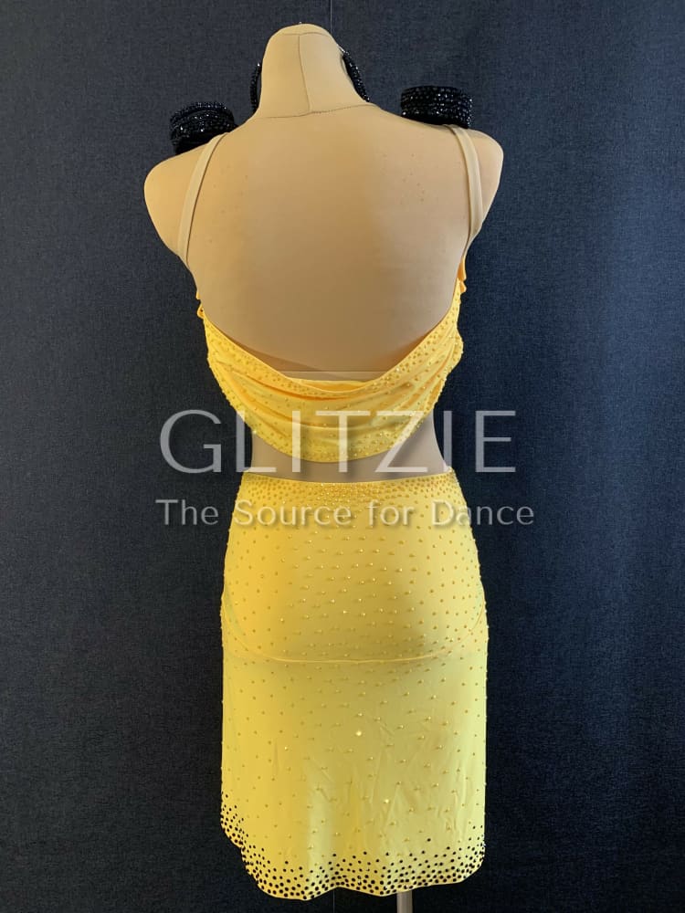 The dress is decorated with a lot of glued rhinestones color Jet SS20 and Citrine Opal SS16. Accessories included: earrings and bracelets with rhinestones.