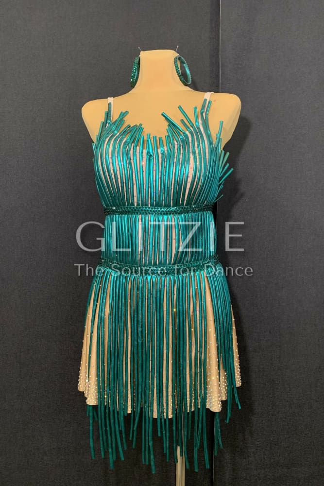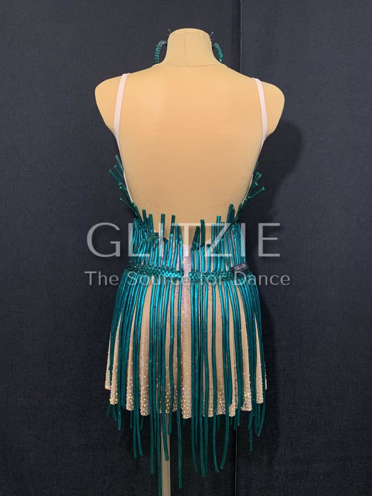 The dress is decorated with glued rhinestones SS20 Emerald and rhinestones SS16 Crystal on the lower part.
