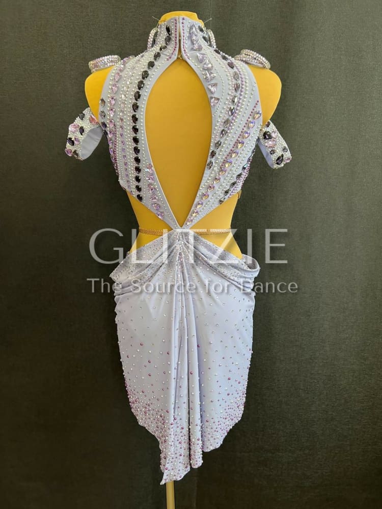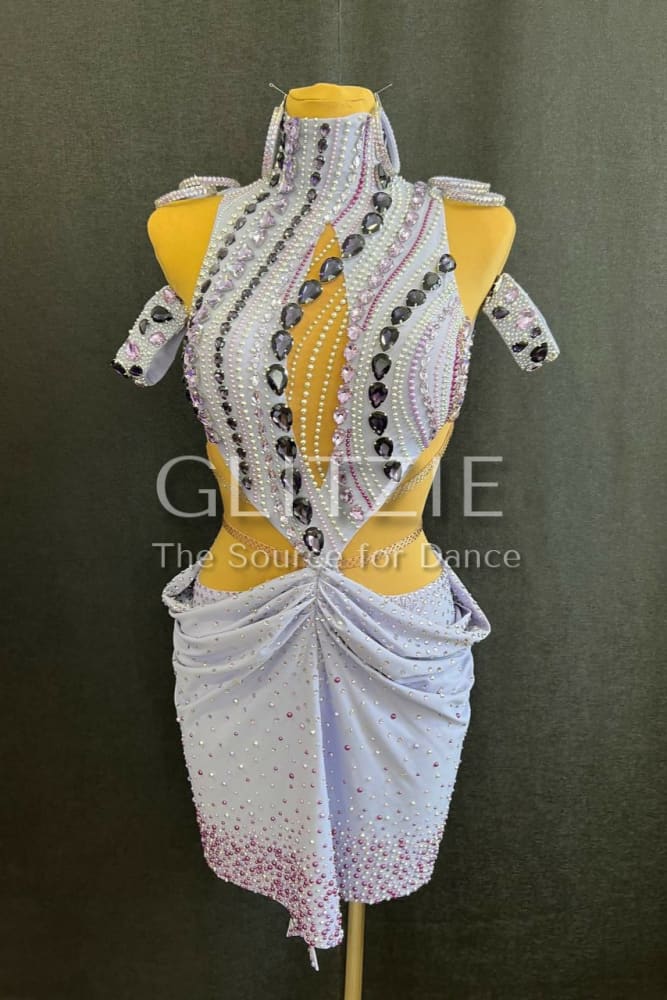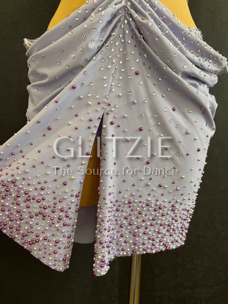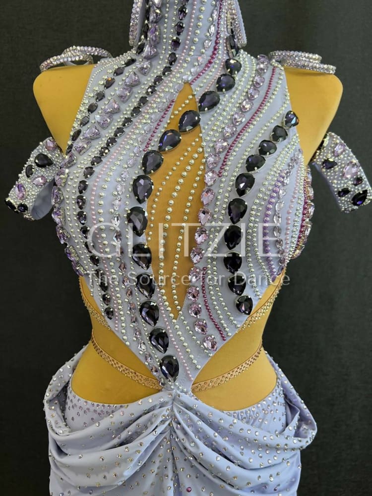 The dress is decorated with sewn rhinestones different shapes and sizes colors Amethyst and Violet, a lot of glued rhinestones Violet SS20, a mass of half-beads color Silver, Lavander ab, Amethyst sizes 3, 5, 6mm.