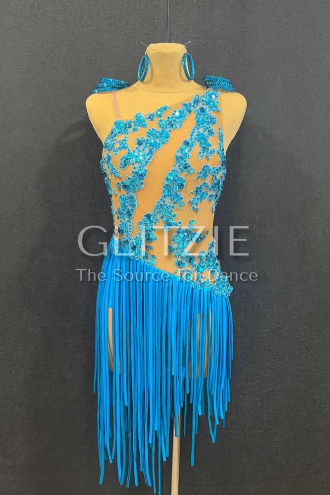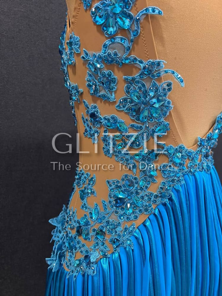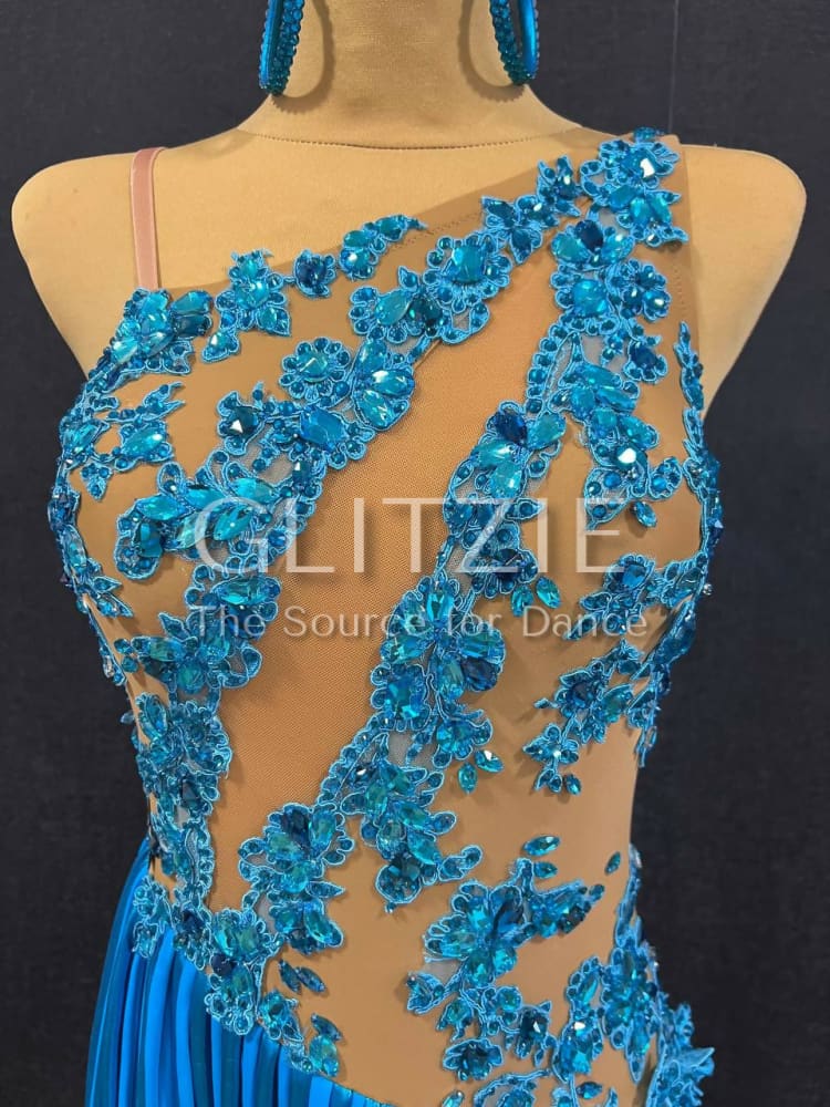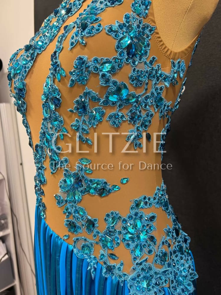 The dress is decorated with sewn laces color Turquoise, all laces are embellished with a lot of big sewn rhinestones different shapes and sizes color Blue Zircon and Aquamarine, glued rhinestones Blue Zircon SS16 and SS20 (similar to Swarovski).