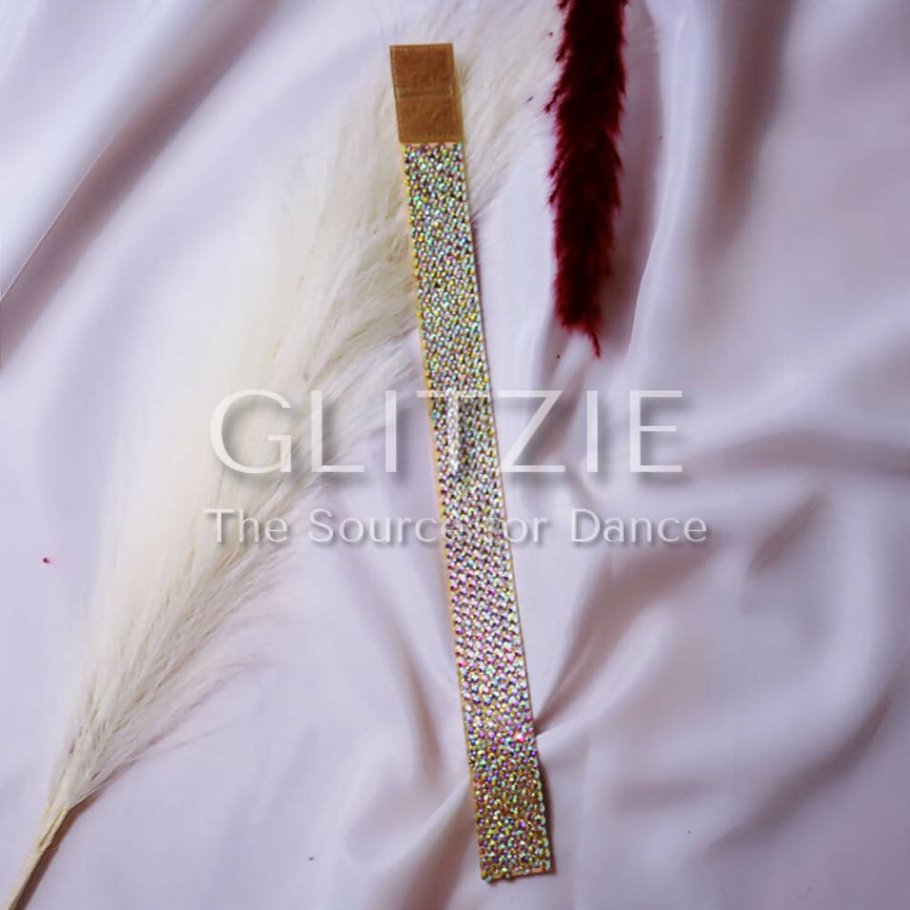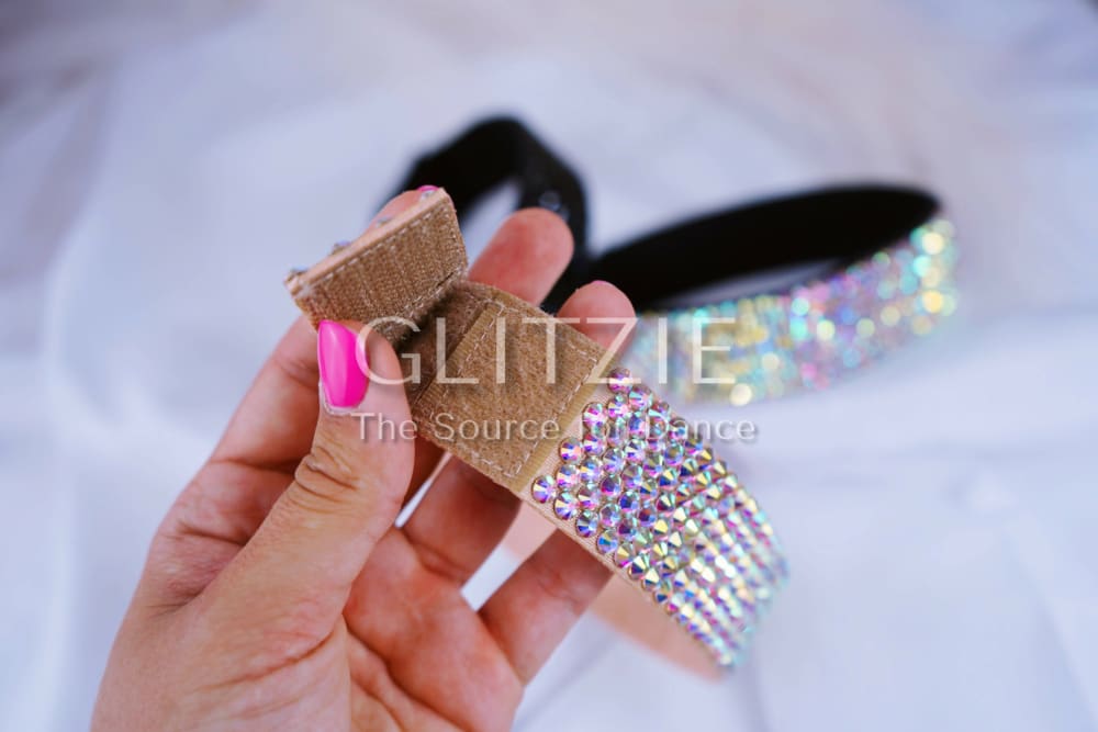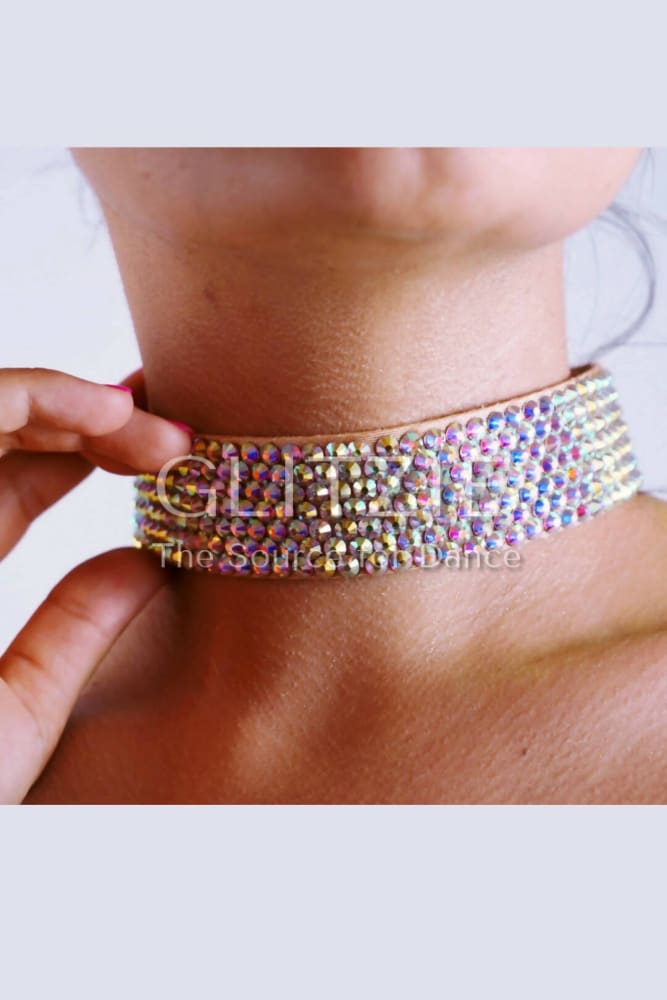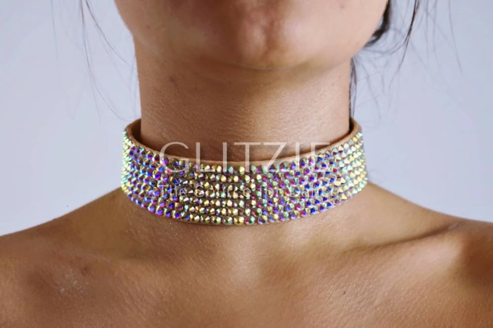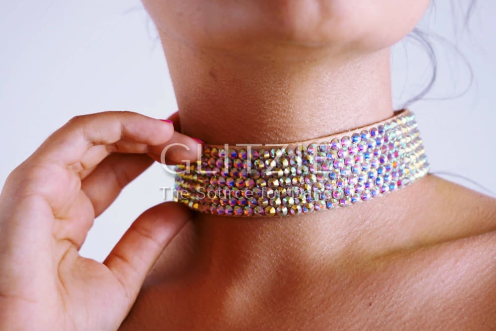 This ab color rhinestone choker is attached around the neck with velcro closure.